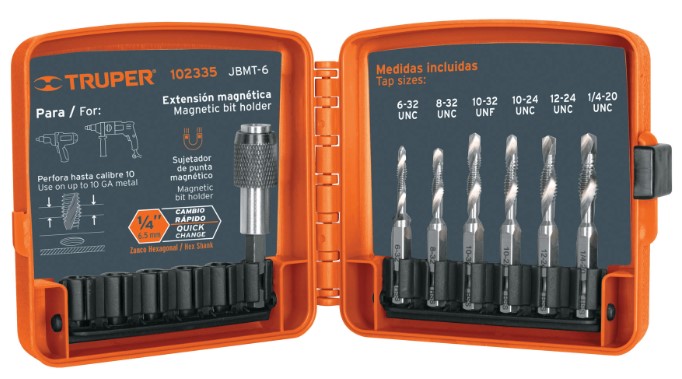 Brocas de: 6 - 32 UNC, 8 - 32 UNC, 10 - 32 UNF, 10 - 24 UNC, 12 - 24 UNC y 1/4 - 20 UNC