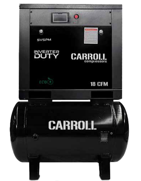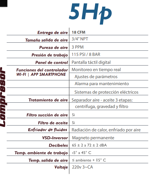 MAGNETO PERMANENTE, TIPO GABINETE MONTADO SOBRE TANQUE DE 300 LITROS, TORNILLO DE DESPLAZAMIENTO POSITIVO DE UNA ETAPA, CON PRESION MÁXIMA DE 130 PSI. Y 18 PCM, TABLERO DIGITAL A COLOR MAM-6080, FILTRO DE SUCCIÓN DE AIRE DE DOS ETAPAS, FILTRO DE ACEITE, SEPARADOR AIRE- ACEITE DE TRES ETAPAS (Centrífuga, gravedad filtro), ACOPLAMIENTO POR BANDA ENTRE MOTOR Y TORNILLO, MOTOR DE 10.0 HP DE MAGNETO PERMANENTE, 220 VOLTS 3 FASES, 60 HZ, VARIADOR DE VELOCIDAD INCLUIDO. SERIE MAX FLOW ECO MODELO 2023