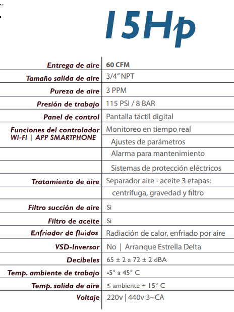 ARRANQUE ESTRELLA DELTA, TIPO GABINETE, TORNILLO DE DESPLAZAMIENTO POSITIVO DE UNA ETAPA, CON PRESION MÁXIMA DE 130 PSI. Y 60 PCM , TABLERO DIGITAL A COLOR MAM-6080, FILTRO DE SUCCIÓN DE AIRE DE DOS ETAPAS, FILTRO DE ACEITE, SEPARADOR AIRE- ACEITE DE TRES ETAPAS (Centrífuga, gravedad filtro), ACOPLAMIENTO DIRECTO ENTRE MOTOR Y TORNILLO, MOTOR DE 15 HP, 220 VOLTS, 60 HZ, CERRADO, CON PROTECCIÓN TIPO IP23.SERIE MAX FLOW MODELO 2023