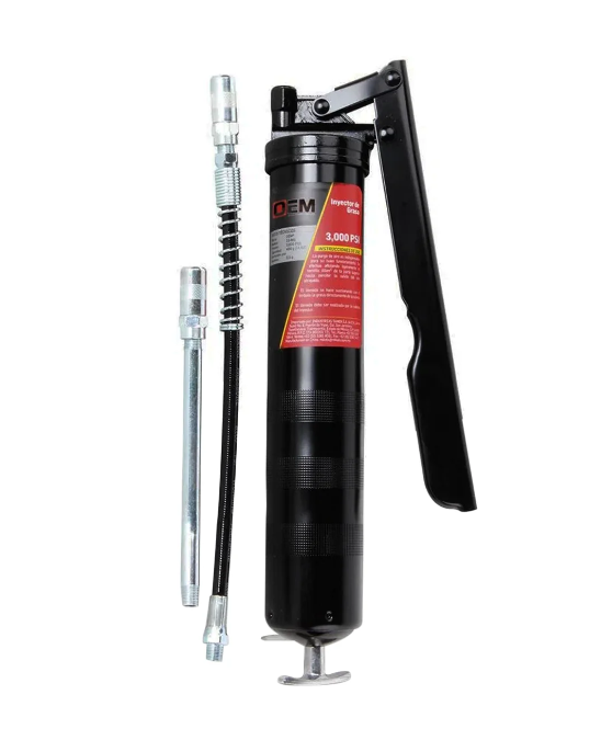 Inyector de Grasa OEM IG/MG 3000 PSI 500 CC es una herramienta manual diseñada para lubricar piezas mecánicas. Está diseñado para inyectar grasa en áreas de difícil acceso en maquinarias, vehículos y equipos industriales. Este inyector de grasa es capaz de suministrar hasta 3000 PSI de presión y tiene una capacidad de 500 CC, lo que permite inyectar una gran cantidad de grasa en un corto período de tiempo. La grasa se almacena en el cartucho o en la cubeta que se conecta a la herramienta. La herramienta se ajusta al cartucho o cubeta mediante un acoplamiento rápido, también cuenta con una manguera de alta presión y una boquilla que se utiliza para inyectar la grasa en las piezas mecánicas. La boquilla es ajustable y se puede girar para alcanzar áreas difíciles de lubricar. Además, cuenta con una palanca de accionamiento fácil que permite controlar la cantidad de grasa que se inyecta en la pieza mecánica. Esta herramienta es muy fácil de usar y requiere poco mantenimiento. Es perfecta para mantener las maquinarias y equipos industriales en buen estado y prolongar su vida útil.
