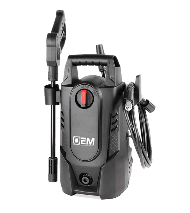 Hidrolavadora de alta presión eléctrica marca OEM con capacidad de presión de 1500 PSI para uso doméstico con manguera de 5 metros de largo, incluye pistola de presión con estructura interna de aluminio, desarrollada para trabajos de limpieza ocasionales y suciedad ligera en toda la casa ayudando a reducir el esfuerzo y el tiempo de trabajo, por ejemplo, en bicicletas, utensilios y muebles de jardín, muy útil para limpieza de fachadas, pisos, manchas de grasa, etc.