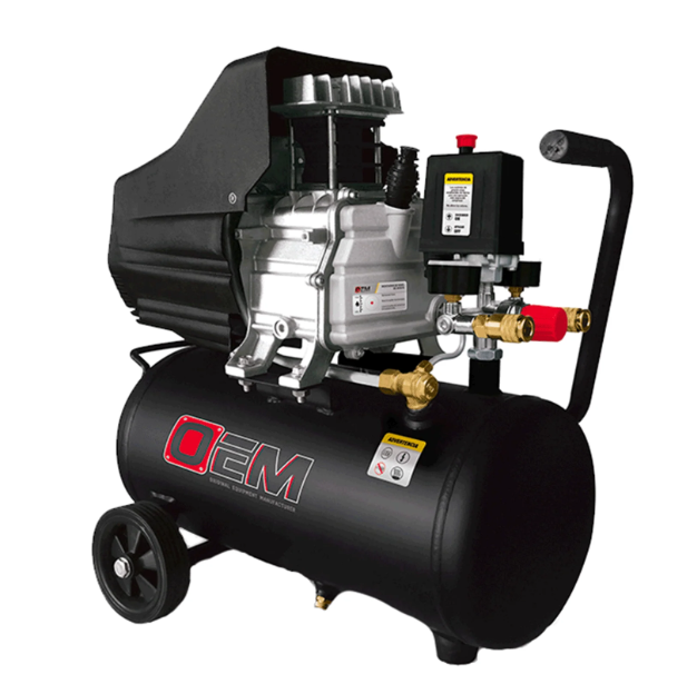 Compresor de aire marca OEM con potencia de 2.5 HP y tanque con capacidad de 25 L, cuenta con embobinado de cobre y doble salida de aire, con maneral soldado para moverlo con seguridad y ruedas traseras para transportarlo fácilmente.