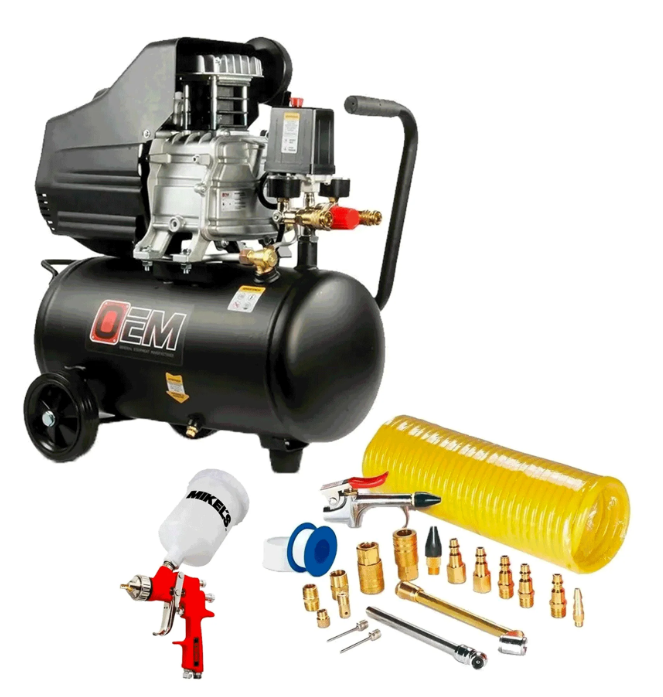 Kit con compresor marca OEM con tanque de 25 litros y motor con potencia de 2.5 HP más manguera de 5 metros más pistola más 20 accesorios neumáticos.