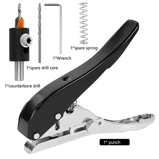 recibirás 1 taladro avellanado y 1 perforador. Estas dos herramientas te ayudan a perforar agujeros con precisión y rapidez. El perforador puede perforar 20 páginas de papel A4, y el grosor de la película de perforación es de 1,5 mm (no se puede perforar película, hoja de hierro metálico).