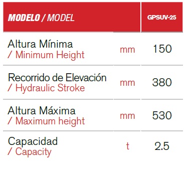 Capacidad 2 ToneladasRango de levante 127 mm a 3